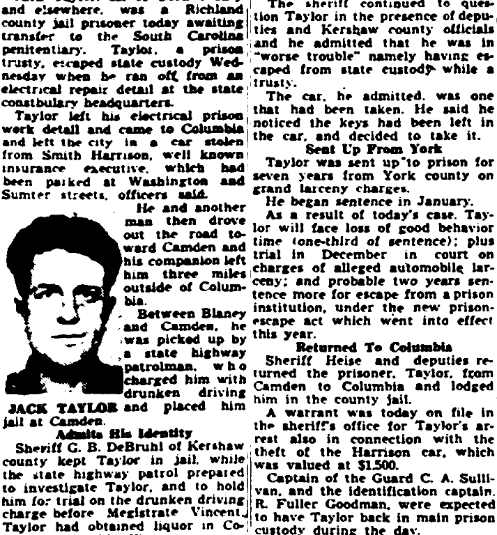 Jack Taylor, 32, of York county and elsewhere, was the Richland county jail prisoner today awaiting transfer to the South Carolina penitentiary. Taylor, a prison trustee, escaped state custody Wednesday when he ran off, from an electrical repair detail at the state constabulary headquarters.