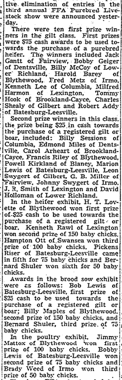 There were ten first prize winners in the gilt class. First prizes were $75 cas awards to be used towards the purchase of a purebred heifer. The winners include Jack Gantt of Fairview, Bobby Geiger of Dentsville, Billy McCoy of Lower Richland, Harold Barey of Blythewood, Fred Metz of Irmo, Kenneth Lee of Columbia, Milfred Harmon of Lexington, Tommy Hook of Brookland-Cayce, Charles Shealy of Gilbert and Robert Addy of Batesburg-Leesville.