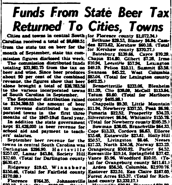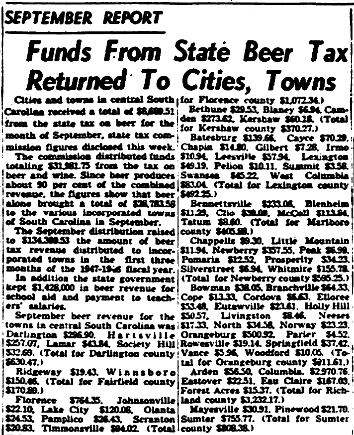 The commission distributed funds totaling $31,981.75 from the tax on beer and wine. Since beer produces about $.90 of the combined revenue, the figures show that beer alone brought a total of $28,783.58 to the various incorporated towns of South Carolina in September.