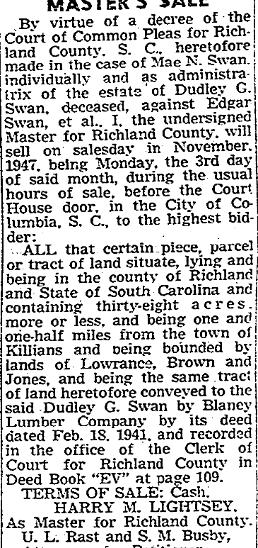 By virtue of a decree of the court of common pleas for Richland County, South Carolina, heretofore made in the case of Mae N. Swan, individually and as administratrix of the estate of Dudley G. Swan, deceased, against Edgar Sawn, et at., I, the undersigned Master for Richland County, will sell on sales day in November, 1947, being Monday, the third day of said month, … Continue reading Master’s Sale