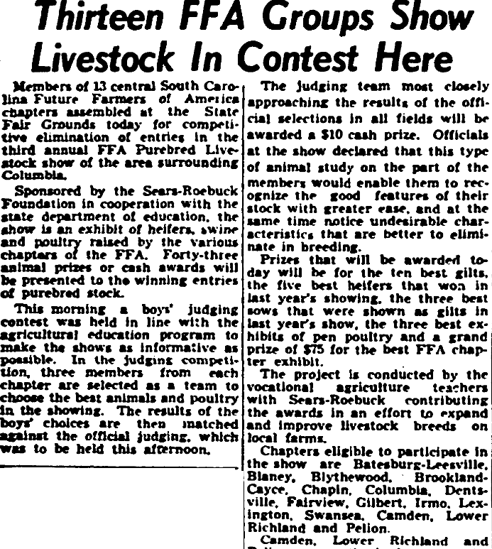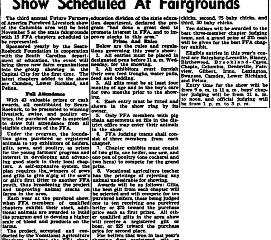 The third annual Future Farmers of America Purebred Livestock show of the Columbia area will be held November 5 at the state fairgrounds with 15 chapters scheduled to be represented. Sponsored a yearly by the Sears Roebucks Foundation in cooperation with the South Carolina Department of education, they will bring three new farm organizations into the group showing in the capital city for the first … Continue reading November 5 – Future Farmers Purebred Stock Show Scheduled At Fairgrounds