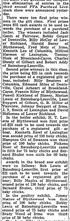 Awards to members of 13 central South Carolina Future Farmers of America chapters who assembled at the State Fair grounds for competitive elimination of entries in the third annual FFA Purebred Livestock show were announced yesterday. There were ten first prize winners in the gilt class. First prizes were $75 cas awards to be used towards the purchase of a purebred heifer. The winners include … Continue reading FFA Winners In Livestock Show Named