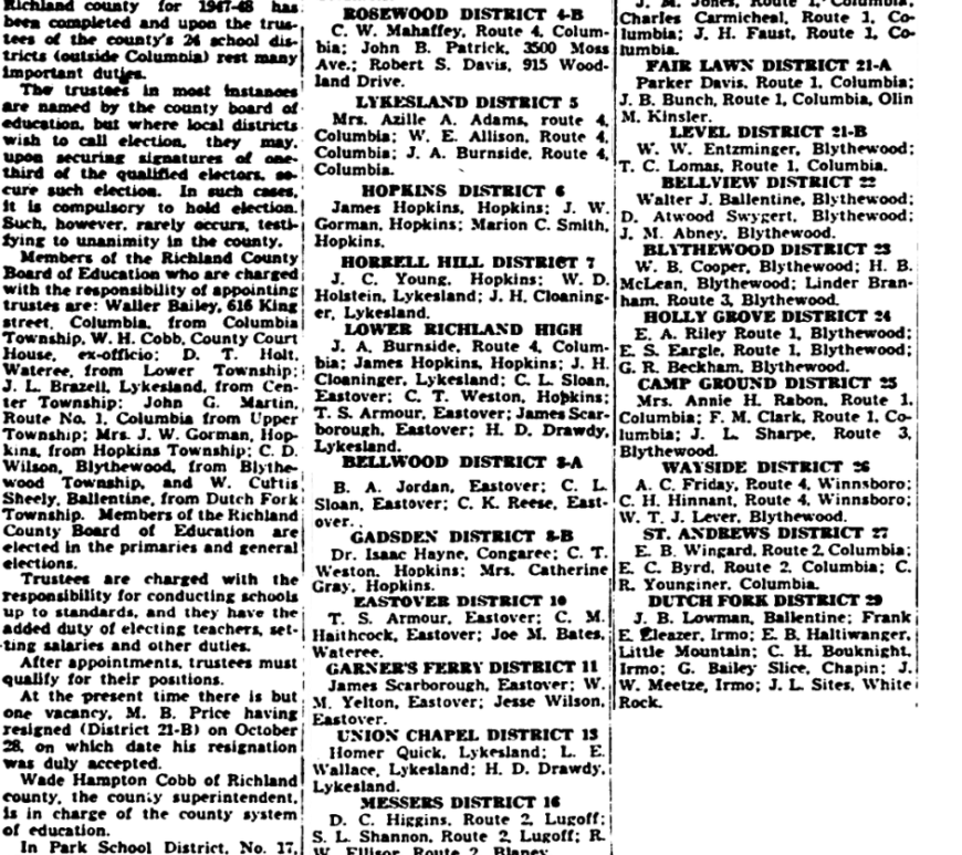 By Mark Warren The list of school trustees for Richland county for 1947-48 has been completed and upon the trustees of the county’s 24 school districts (outside Columbia) rest many important duties. The trustees in most instances are named by the county board of education, but where local districts wish to call election, they may, upon securing signatures of one-third of the qualified electors, secure … Continue reading The Day’s Medley – Going On In City and County.