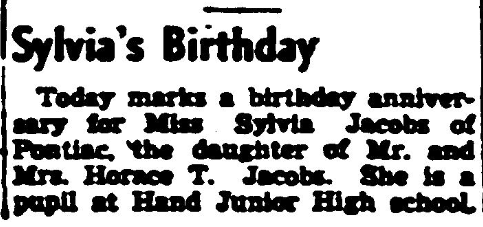Today marks a birthday anniversary for Miss Sylvia Jacobs of Pontiac, the daughter of Mr. and Mrs. Horace T. Jacobs (Clara Mae Jacobs). She is a pupil at Hand Junior High School. Continue reading Sylvia’s Birthday