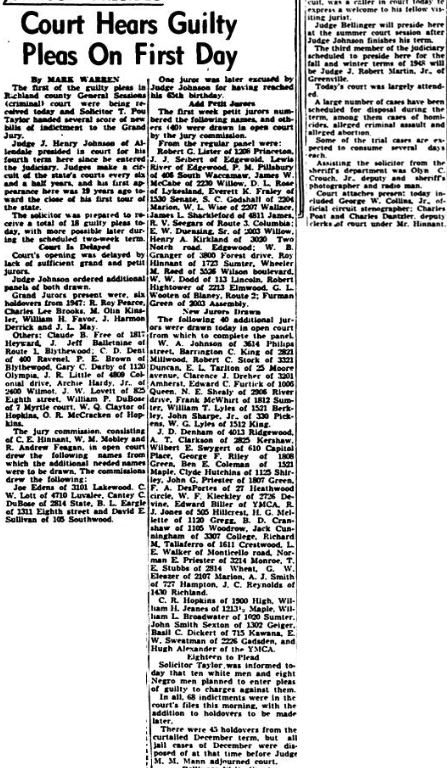 Gran Jurors present were, six holdovers from 1947; R. Roy Pearce, Charles Lee Brooks, M. Olin Kinsler, William H. Favor, J. Harmon Derrick and J. L. May.
