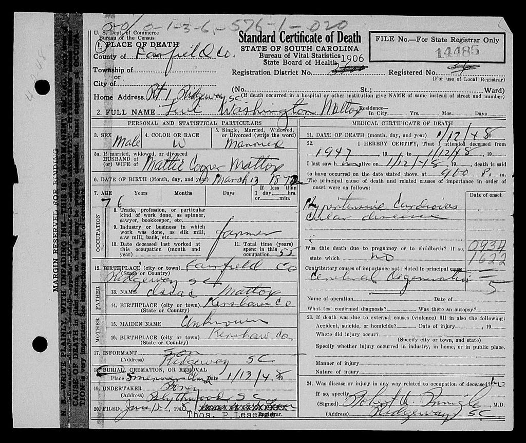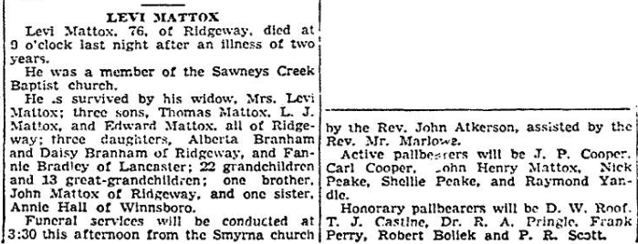 He is survived by his widow, Mrs. Levi Mattox; three sons, Thomas Mattox, L. J. Mattox, and Edward Mattox, all of Ridgeway; three daughters, Alberta Branham and Daisy Branham of Ridgeway, and Fannie Bradley of Lancaster; 22 grand children and 13 great grandchildren; one brother, John Mattox, and one sister, Annie Hall of Winnsboro.