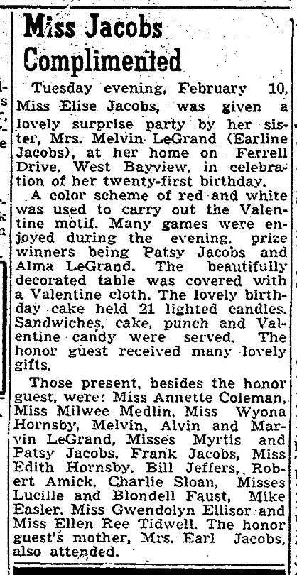 Tuesday evening, February 10, Miss Elise Jacobs, was given a lovely surprise party by her sister, Mrs. Melvin LeGrand (Earline Jacobs), at her home on Ferrell Drive, West Bayview, in celebration of her twenty-first birthday.