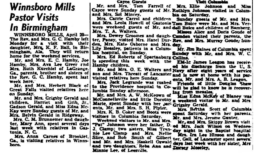 WINNSBORO MILLS, April 29 – The Rev. and MRs. G. C. Hamby left Monday for a visit with their daughter, Mrs. K. F. Ball, in Brimingham, Ala. They will return home for the weekend services.