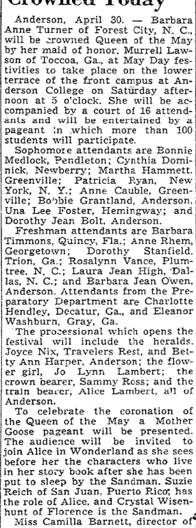 Anderson, April 30. – Barbara Anne Turner of Forest City, N. C., will be crowned Queen of the May by her maid of honor, Murrell Lawson of Toccoa, Ga., at May Day fstivites to take front campus at Andeson College on Saturday afternoon at 5 o’clock. She will be accompanied by a court of 16 attendants and will be entertained by a pageant in which more than 100 students will participate.