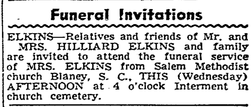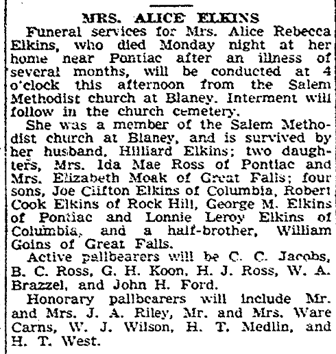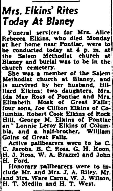 She was a member of the Salem Methodist church at Blaney, and is survived by her husband, Hillard Elkins; two daughters, Mrs. Ida Mae Ross of Pontiac and Mrs. Elizabeth Moak of Great Falls; four sons, Joe Clifton Elkins of Columbia, Robert Cook Elkins of Rock Hill, George M Elkins of Pontiac and Lonnie Leroy Elkins of Columbia, and a half-brother, William Goins of Great Falls.