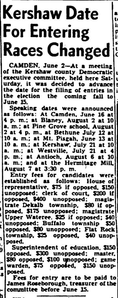 Speaking dates were announced as follows; At Camden, June 16 at 4 p.m.; at Blaney, August 2 at 10 a.m.; at Pine Grove school, August 2 at 4 p.m.; at Bethune July 12 at 10 a.m.; at Mt. Pisgah, June 13 at 10 a.m.; at Kershaw, July 21 at 10 a. m.; at Westville, July 21 at 4 p.m.; at Antioch, August 6 at 10 a.m.; and at the Hermitage Mill, August 7 at 3:30 p.m.