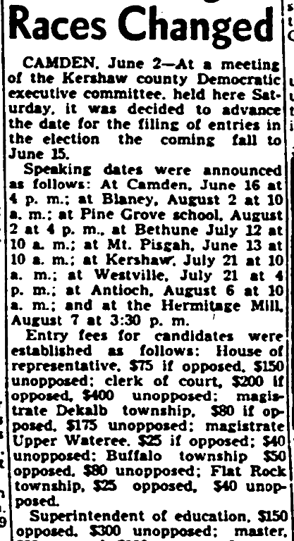 Camden, June 2 – At a meeting of the Kershaw county Democratic executive committee, held here Saturday, it was decided to advance the date for the filing of entries in the election the coming fall to June 15.