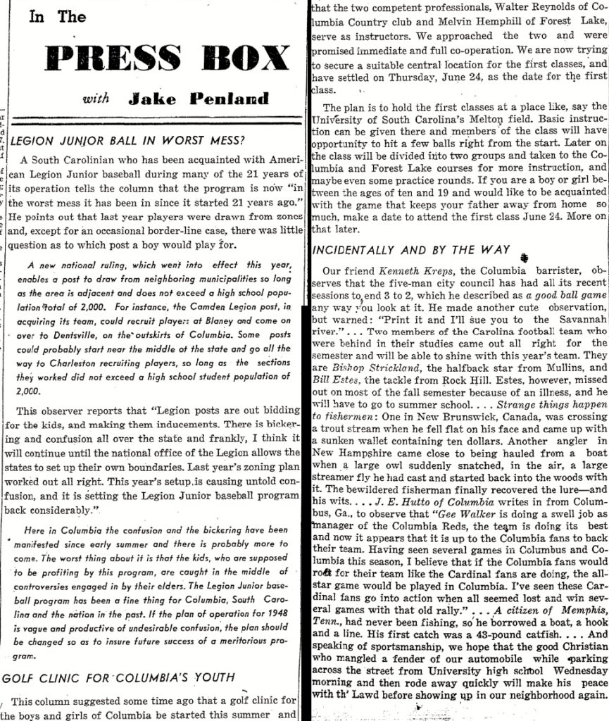 Our friend Kenneth Kreps, the Columbia barrister, observes that the five-man city council has had all its recent session to end 3 to 2, which he described as a good ball game any way you look at it. He made another cute observation, but warned: “Print it and I’ll sue you to the Savannah River.” . . . Two members of the Carolina football team who were behind in their studies came out all right for the semester and will be able to shine with this year’s team. They are Bishop Strickland, the halfback star from Mullins, and Bill Estes, the tackle from Rock Hill. Estes, however, missed out on most of the fall semester because of an illness, and he will have to go to summer school. . . . Strange things happen to fishermen: One in New Brunswick, Canada, was crossing a trout steam when he fell flat on his face and came up with a sunken wallet containing ten dollars. Another angler in New Hampshire came close to being hauled from a boat when a large owl suddenly snatched, in the air, a large streamer fly he had cast and started back into the woods with it. The bewildered fisherman finally recovered the lure and – and his wits . . . . J. E. Hutto of Columbia writes in from Columbus, Georgia, to observe that “Gee Walker is doing a swell job as manager of the Columbia Reds, the team is doing its best and now it appears that it is up to the Columbia fans to back their team. Having seen several games in Columbus and Columbia this season, I believe that if the Columbia fans would root for their team like the Cardinal fans are doing, the all star game would be played in Columbia. I’ve seen these Cardinal fans go into action when all seemed lost and win several games with that old rally.” . . . A citizen of Memphis, Tennessee, had never been fishing, so he borrowed a boat, a hook and a line. His first catch was a 43-pound catfish. . . . And speaking of sportsmanship, we hope that the good Christian who mangled a fender of our automobile while parking across the street from University high school Wednesday morning and then rode away quickly will make his peace with th’ Lawd before showing up in our neighborhood again.