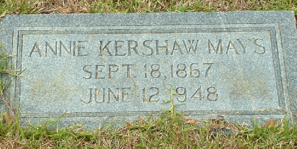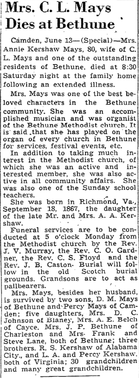 Annie Catherine Kershaw Mays, 80, of Camden, wife of C. L. Mays and one of the outstanding residents of Bethune, died at 8:30 Saturday night, June 12, 1948 at the family home following an extended illness.