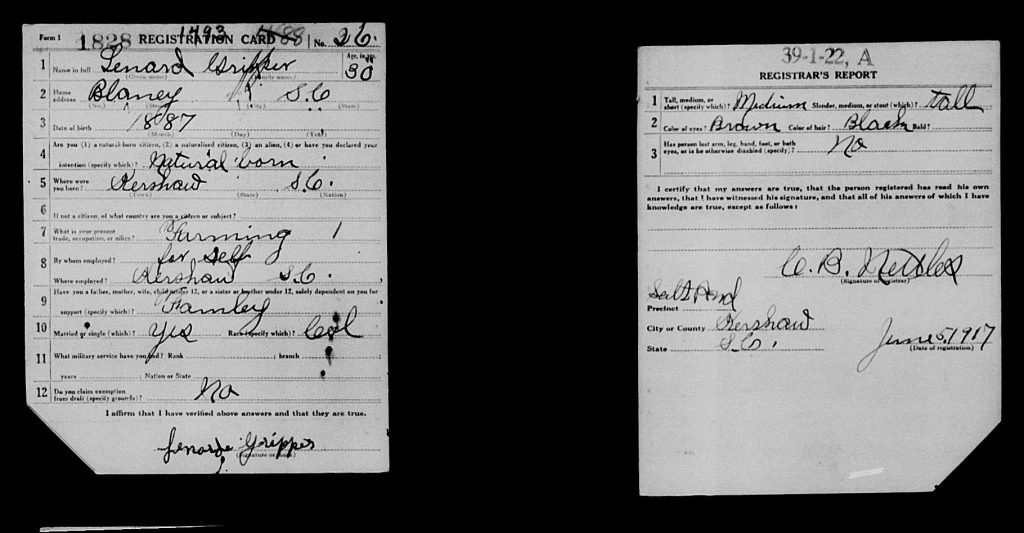 On 05 Jun 1917 in Kershaw, South Carolina, USA, Lenard Gripper completed a United States World War I Registration Card, listing his address as Blaney, South Carolina. His date of birth as 1887 in Kershaw, South Carolina, a natural born citizen. He trade was farming for himself in Kershaw, South Carolina. Listing himself as married with a family, of the colored race, and described as medium built, tall in height, brown eyes, black hair.