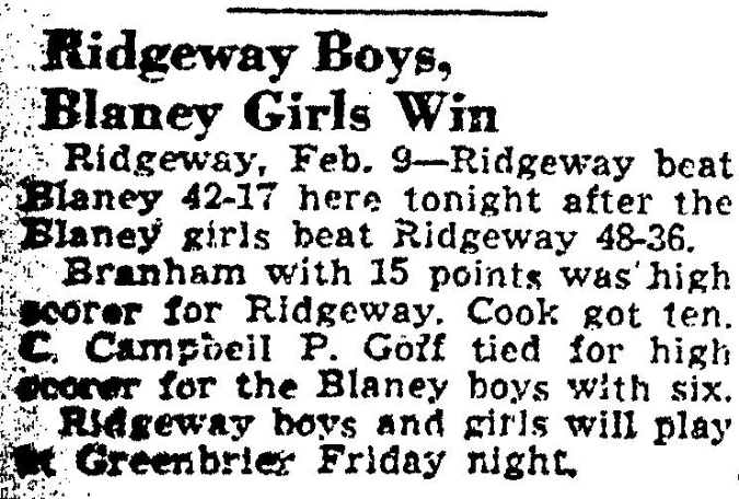 Branham with 15 points was high scorer for Ridgeway. Cook got ten. C. Campbell P. Goff tied for High scorer for the Blaney boys with six.