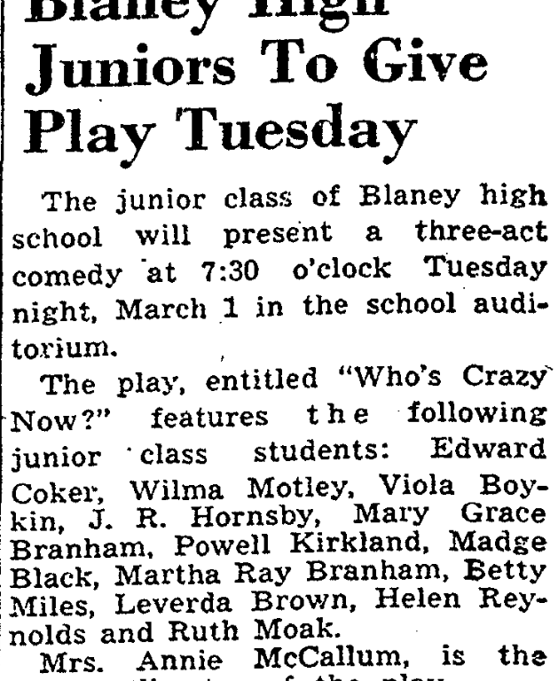 The play, entitled “Who’s Crazy Now?” features the following juniors class students: Edward Coker, Wilma Motley, Mary Grace Branham, Powell Kirkland, Madge Black, Martha Ray Branham, Betty Miles, Leverda Brown, Helen Reynolds and Ruth Moak.