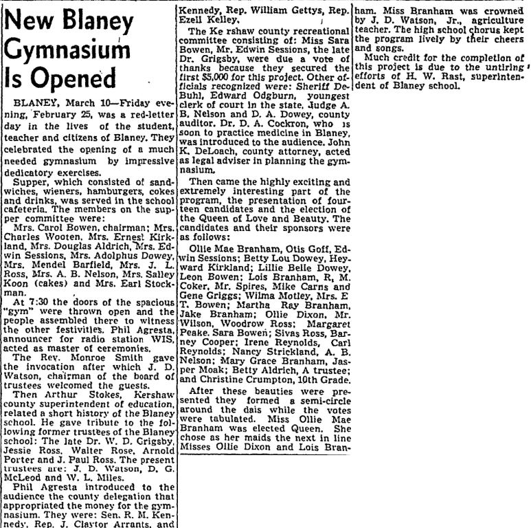 The Kershaw county recreational committee consisting of; Miss Sara Bowen, Mr. Edwin Sessions, the late Dr. Grigsby, were due a vote of thanks because they secured the first $5,000 for this project. Other officials recognized were: Sheriff DeBuhl, Edward Odgburn, youngest clerk of court in the state, Judge A B Nelson and D. A. Dowey, county auditor, Dr. D. A. Cockron, who is soon to practice medicine in Blaney, was introduced to the audience. John K Deloach, county attorney, acted as legal adviser in planning the gymnasium.