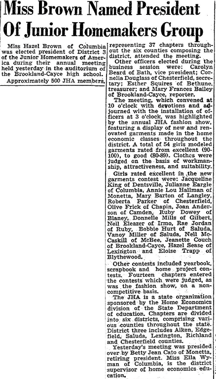 Girls rated excellent in the new garments contest were: Jacqueline King of Dentsville, Julianne Earlge of Columbia, Annie Lou Hallman of Monetta, Mary Barton of Langley, Robert Parker of Chesterfield, Olive Frick of Chapin, Joan Anderson of Camden, Ruby Dowey of Blaney, Donelle Mills of Gilbert, Nell Eleazer of Irmo, Rea Jordan of Ruby, Bobbie Hurt of Saluda, Vanoy Miller of Saluda, Nell McCaskill of McBee, Jeanette Couch of Brookland-Cayce, Hazel Sease of Lexington and Eloise Trapp of Blythewood.