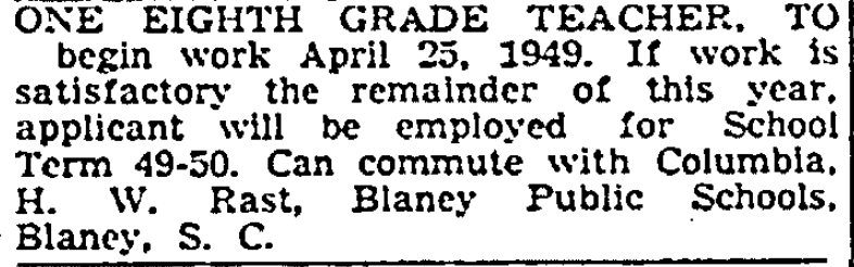 ONE EIGHT GRADE TEACHER, TO  begin work April 25, 1949. If work is satisfactory the remainder of this year, applicant will be employed for school Term 49-50. Can commute with Columbia, H. W. Rast, Blaney Public Schools, Blaney, SC.