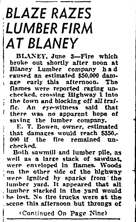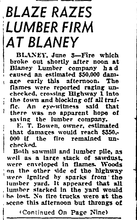BLANEY, June 3 – Fire which broke out shortly after noon at Blaney Lumber company had caused an estimated $50,000 damage early this afternoon. The flames were reported raging unchecked, crossing Highway 1 into the town and blocking off all traffic. An eye-witness said that there was no apparent hope of saving the lumber company.