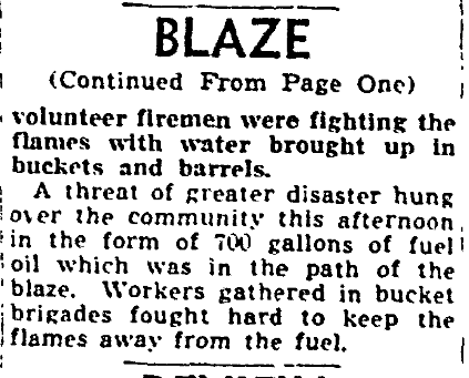 A threat of great disaster hung over the community this afternoon in the form of 700 gallons of fuel oil which was in the path of the blaze. Workers gathered in bucket brigades fought hard to keep the flames away from the fuel.
