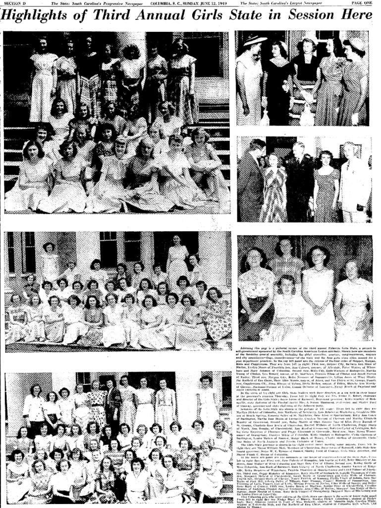 Adorining this page is a pictorial review of the third annual Palmetto Girls State, a project of self-government sponsored by the South Carolina American Legion auxiliary. Shown here are members of the feminine general assembly, including the chief executive, senators, congresswomen, mayors and city councilmen – Oops, councilwomen – of the state and the four girls state cities named for a past department president. In the top left panel are the citizens of the four cities of Skipper, Morgan, Bikle and Capplemann. They are from left to right; First row, Skipper City, Barbara Ann Shaw of Marrion, Evelyn Moore of Fountain Inn, Ann Colcock mayors, of Allendale, Patsy Waters of Winnsboro and Mary Johnson of Columbia. Second row, Bikle City, Ruth Watkins of Bishopville, Martha Young of Clinton, Lois Bozard, mayor, of St. Matthews, Frances Winns of CLinton and Janell Norton of Easley, Third row, Morgan City, Dana Hinson of Tatum, Doris Bethea, mayor, of Dillion, Blanche Ann Worthy of Chester, Marianne Farmer of Union, Connie Osborne of Lancaster, Nancy Heath of Pageland and Joyce Tzinieris of Aiken.