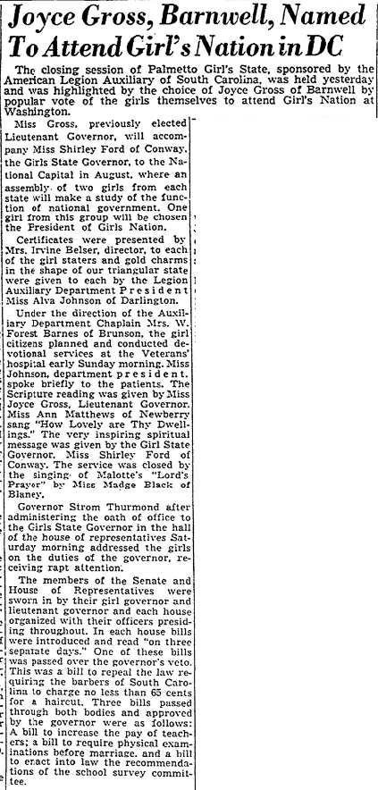 The closing session of Palmetto Girl’s State, sponsored by the American Legion Auxiliary of South Carolina, was held yesterday and was highlighted by the choice of Joyce Gross of Barnwell by popular vote of the girls themselves to attend Girl’s Nation at Washington.