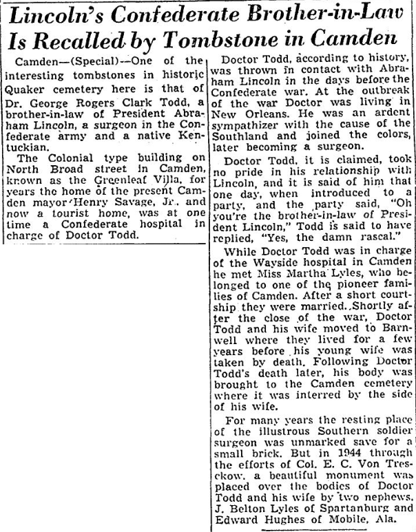 Camden-(Special) –One of the interesting tombstones in historic Quaker cemetery here is that of Dr. George Rogers Clark Todd, a brother-in-law of President Abraham Lincoln, a surgeon in the Confederate army and a native Kentuckian. The Colonial type building on North Broad street in Camden, known as the Greenleaf Villa, for years the home of the present Camden mayor Henry Savage, Jr, and now a … Continue reading Lincoln’s Confederate Brother-in-Law Is Recalled by Tombstone in Camden