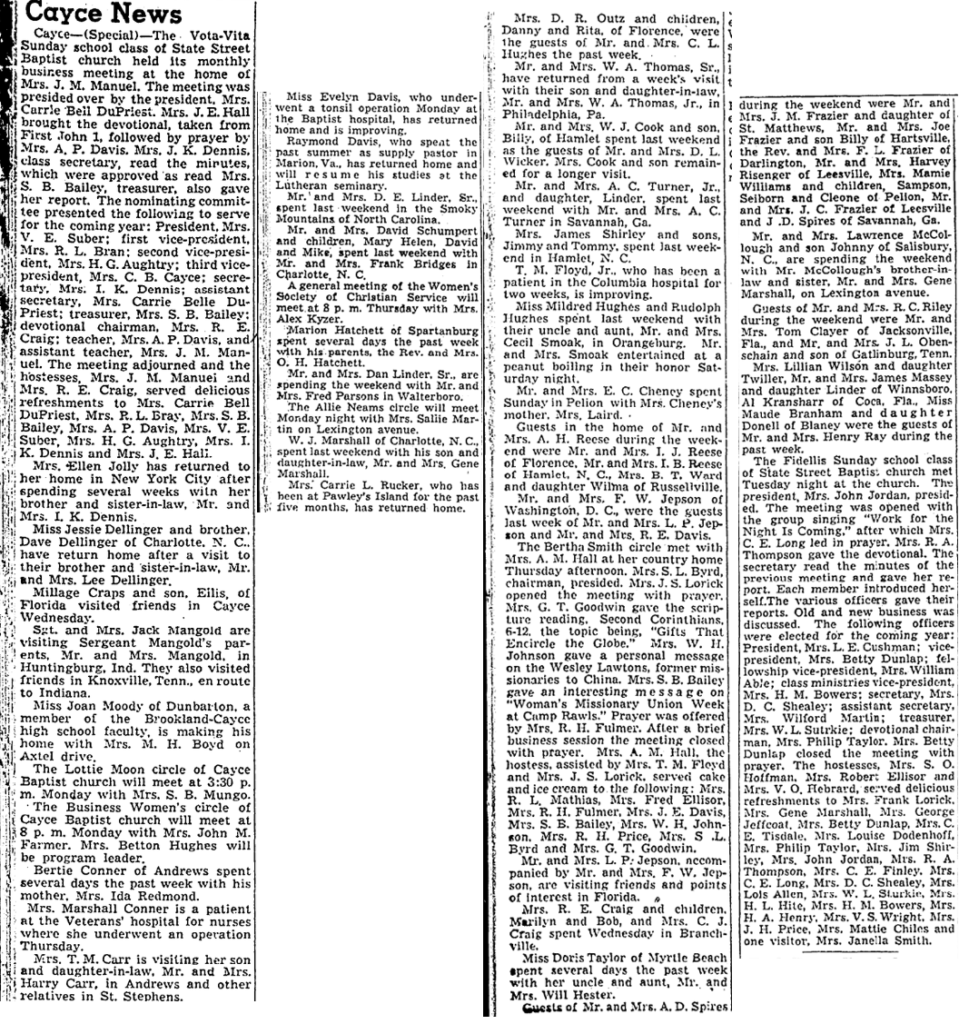 Cayce – (Special) – The Vota-Vita Sunday school class of State Street baptist church held its monthly business meeting at the home of Mrs. J. M. Manuel. The meeting was presided over by the president, Mrs. Carrie Bell DuPriest. Mrs. J. E. Hall brought the devotional, taken from First John 1, followed by prayer by Mrs. A. P. Davis, Mrs. J. K. Dennis, class secretary, read the minutes, which were approved as read Mrs. S. B. Bailey, treasurer, also gave her report, the nominating committee presented the following to serve for the coming year: President, Mrs. V. E. Suber; first vice-president, Mrs. R. L. Bran; second vice-president, Mrs. H. G. Aughtry; third vice-president, Mrs. C. B. Cayce; secretary, Mrs. I. K. Dennis; assistant secretary, Mrs. Carrie Belle DuPriest; treasurer, Mrs. S. B. Bailey; devotional chairman, Mrs. R. E. Craig; teacher, Mrs. A. P. Davis, and assistant teacher, Mrs. J. M. Manuel. The meeting adjourned and the hostesses, Mrs. J. M Manuel and Mrs. R. E. Craig, served delicious refreshments to Mrs. Carrie Bell DuPriest, Mrs. R. L. Bray, Mrs. S. B. Bailey, Mrs. A. P. Davis, Mrs. V. E. Suber, Mrs. H. G. Aughtry, Mrs. I. K. Dennis and Mrs. J. E. Hall.