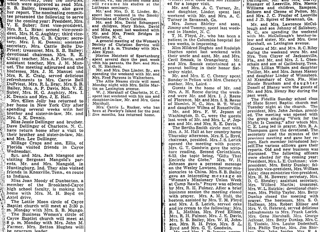 Cayce – (Special) – The Vota-Vita Sunday school class of State Street baptist church held its monthly business meeting at the home of Mrs. J. M. Manuel. The meeting was presided over by the president, Mrs. Carrie Bell DuPriest. Mrs. J. E. Hall brought the devotional, taken from First John 1, followed by prayer by Mrs. A. P. Davis, Mrs. J. K. Dennis, class secretary, read the minutes, which were approved as read Mrs. S. B. Bailey, treasurer, also gave her report, the nominating committee presented the following to serve for the coming year: President, Mrs. V. E. Suber; first vice-president, Mrs. R. L. Bran; second vice-president, Mrs. H. G. Aughtry; third vice-president, Mrs. C. B. Cayce; secretary, Mrs. I. K. Dennis; assistant secretary, Mrs. Carrie Belle DuPriest; treasurer, Mrs. S. B. Bailey; devotional chairman, Mrs. R. E. Craig; teacher, Mrs. A. P. Davis, and assistant teacher, Mrs. J. M. Manuel. The meeting adjourned and the hostesses, Mrs. J. M Manuel and Mrs. R. E. Craig, served delicious refreshments to Mrs. Carrie Bell DuPriest, Mrs. R. L. Bray, Mrs. S. B. Bailey, Mrs. A. P. Davis, Mrs. V. E. Suber, Mrs. H. G. Aughtry, Mrs. I. K. Dennis and Mrs. J. E. Hall.