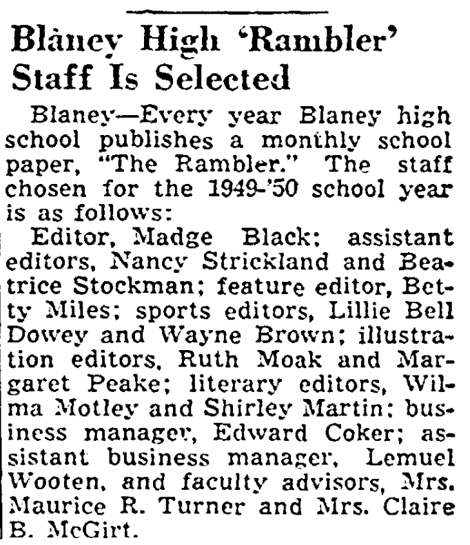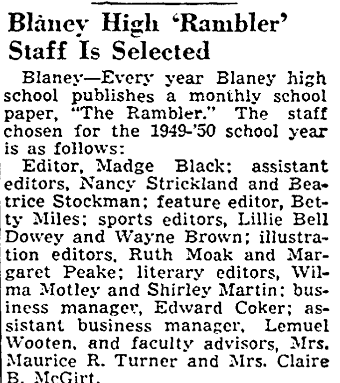 Blaney – Every year Blaney high school published a monthly school paper, “The Rambler.” The staff chosen for the 1949-’50 is as follows;