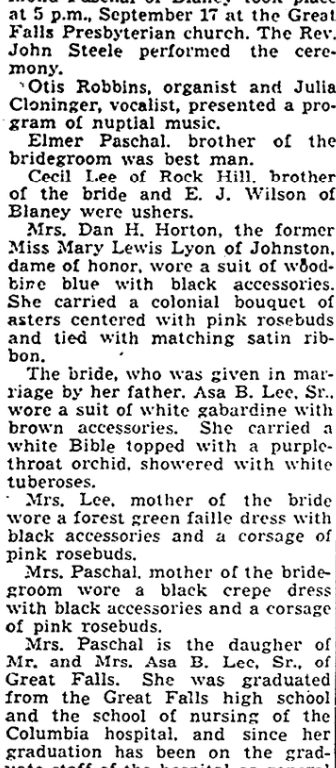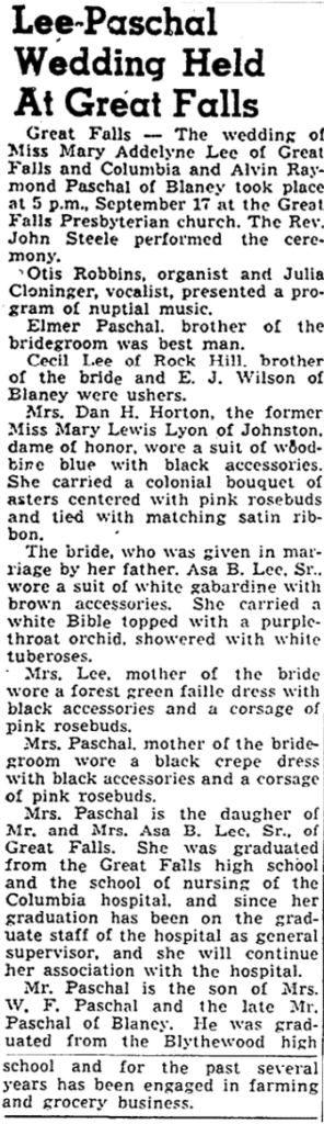 Great Falls – The wedding of Miss Mary Addelyne Lee of Great Falls and Columbia and Alvin Raymond Paschal of Blaney took place at 5 p.m., September 17 at the great Falls Presbyterian church. The Rev. John Steele performed the ceremony.