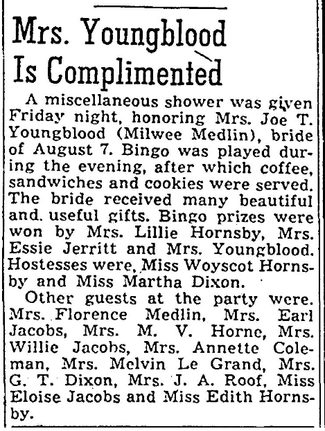 A miscellaneous shower was given Friday night, honoring Mrs. Joe T. Youngblood (Milwee Medlin), bride of August 7. Bingo was played during the evening, after which coffee, sandwiches and cookies were served. The bride received many beautiful and useful gifts. Bingo prizes were won by Mrs. Lillie Hornsby, Mrs. Essie Jerritt and Mrs. Youngblood. Hostesses were, Miss Woyscot Hornsby and Miss Martha Dixon.