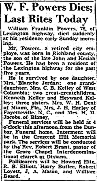 William Franklin Powers, 78 of Lexington Highway, died suddenly at his residence early Sunday morning, May 14, 1950.