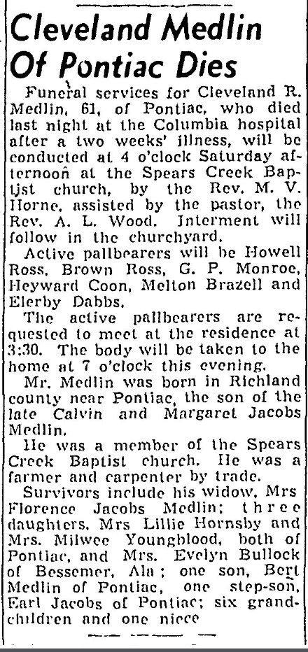 Funeral services for Cleveland R. Medlin, 61, of Pontiac, who died last night at the Columbia hospital after a two weeks’ illness, will be conducted at 4 o’clock Saturday afternoon at the Spears Creek Baptist church, by the late Rev. M. V. Horne, assisted by the pastor, the Rev. A. L. Wood. Interment will follow in the churchyard.