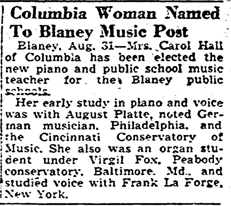Blaney, Aug. 31 – Mrs. Carol Hall of Columbia has been elected the new piano and public school music teacher for the Blaney public schools.