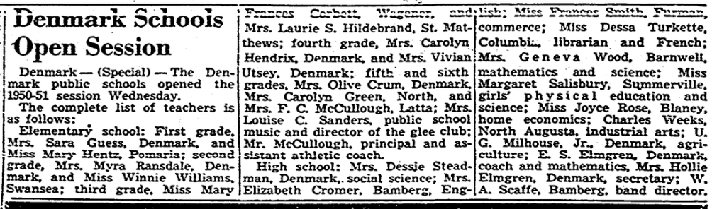 Elementary school; First grade, Mrs. Sara Guess, Denmark, and Mrs. Myra Ransdale, Denmark, and Miss Winnie Williams, Swansea; third grade, Miss Mary France Corbett, Wagener, and Mrs. Laurie S. Hildebrand, St. Matthews; fourth grade, Mrs. Carolyn Hendrix, Denmark, and Mrs. Vivian Utsey, Denmark; fifth and sixth grades, Mrs. Olive Crum, Denmark, Mrs. Carolyn Green, North, and Mrs. F. C. McCullough, Latta; Mrs. Louise C. Sanders, public school music and director of the glee club; Mr. McCullough, principal and assistant athletic coach.