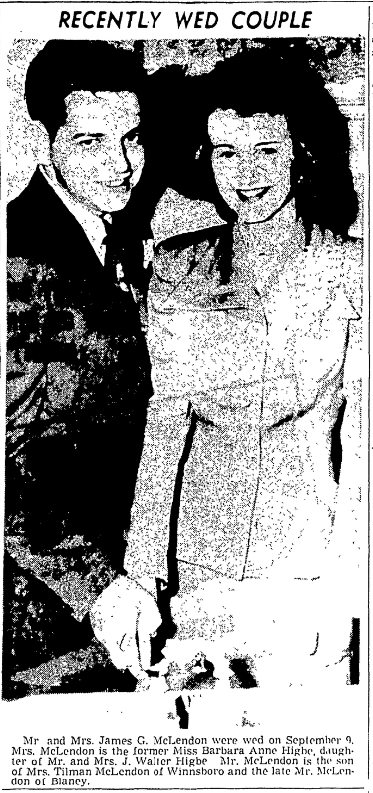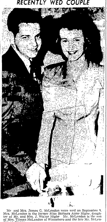 Mr. and Mrs. James G. McLendon were wed on September 9. Mrs. McLendon is the former Miss Barbara Anne Higbe, daughter of Mr. and Mrs. J. Walter Highbe. Mr. McLendon is the son of Mrs. Tilman McLendon of Winnsboro and the late Mr. McLendon of Blaney.