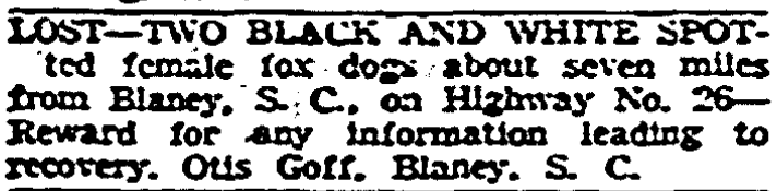 LOST – TWO BLACK AND WHITE SPOTted female dogs about seven miles from Blaney, S. C., on Highway No. 26 – Reward for any information leading to recovery. Otis Goff, Blaney. S. C.