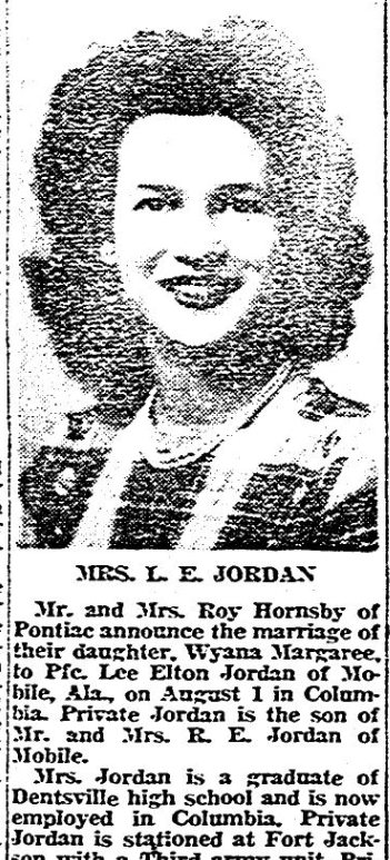 MRS. L. E. JORDAN Mr. and Mrs. Roy Hornsby (Lillie Hornsby) of Pontiac announce the marriage of their daughter, Wyana Margaree, to Pfc. Lee Elton Jordan of Mobile, Ala., on August 1 in Columbia. Private Jordan is the son of Mr. and Mrs. R. E. Jordan of Mobile. Mrs. Jordan is a graduate of Dentsville high school is now employed in Columbia. Private Jordan is … Continue reading Recent Bride