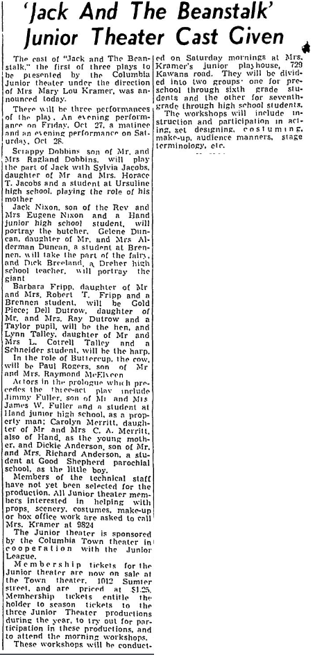 The cast of “Jack and The Beanstalk,” the first of three plays to be presented by the Columbia Junior theater under the direction of Mrs. Mary Lou Kramer, was announced today.
