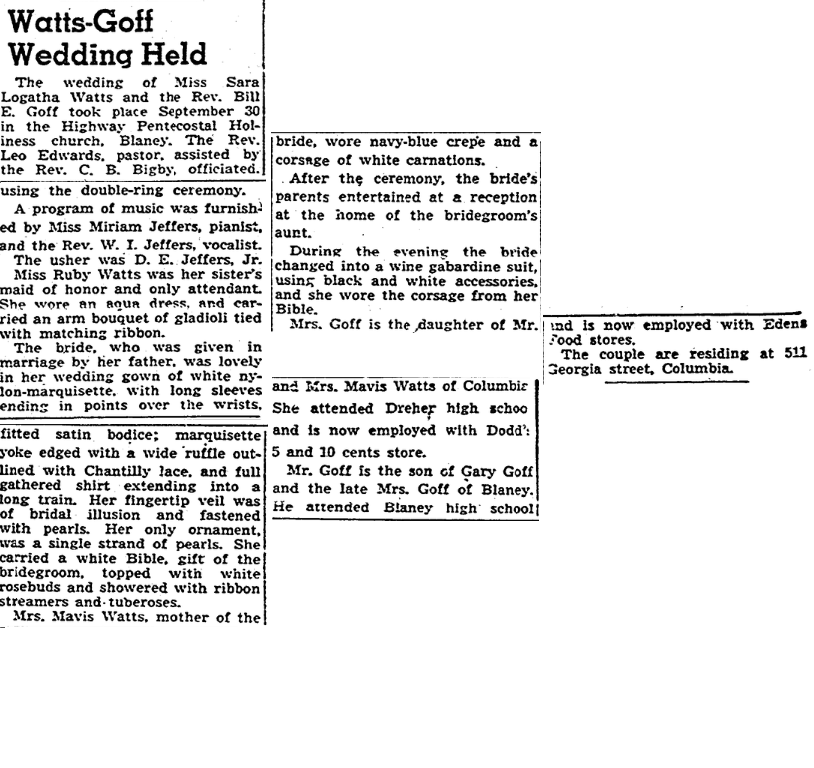 Mrs. Goff is the daughter of Mr. and Mrs. Mavis Watts (Jessie Irene Goff Watts) of Columbia. She attended Dreher high school and is now employed with Dodd’s 5 and 10 cents store.