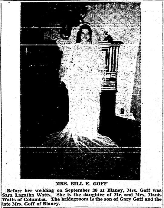Before her wedding on September 30 at Blaney, Mrs. Goff was Sara Lagatha Watts. She is the daughter of Mr. and Mrs. Manis Watts (Jessie Irene Goff Watts) of Columbia. The bridegroom is the son of Gary Goff and the late Mrs. Goff of Blaney.