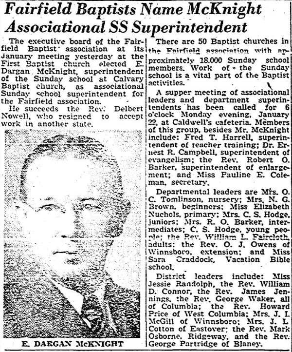 The executive board of the Fairfield Baptist Association at its January meeting yesterday at the First Baptist Church elected E. Dargan McKinght, superintendent of the Sunday school at Calvary Baptist Church, as associational Sunday school superintendent for the Fairfield association.