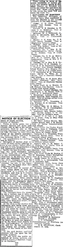 Salt Pond: Clyde M. Boykin, C. W. Branham, Albert Humphries. Vote at A. Dowey’s store.
