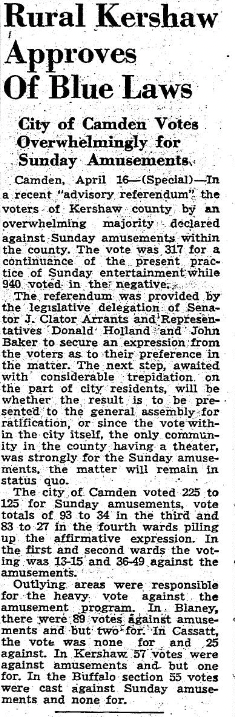 Camden, April 16 – (Special) – In a recent “advisory referendum” the voters of Kershaw County by an overwhelming majority declared against Sunday amusements within the county. The vote was 317 for a continuance of the present practice of Sunday entertainment while 940 voted in the negative.