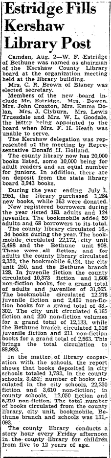 Camden, Aug. 2 – W. F. Estridge of Bethune was named as chairman of the Kershaw County Library board at the organization meeting held at the library building.