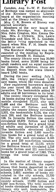 Camden, Aug. 2 – W. F. Estridge of Bethune was named as chairman of the Kershaw County Library board at the organization meeting held at the library building.