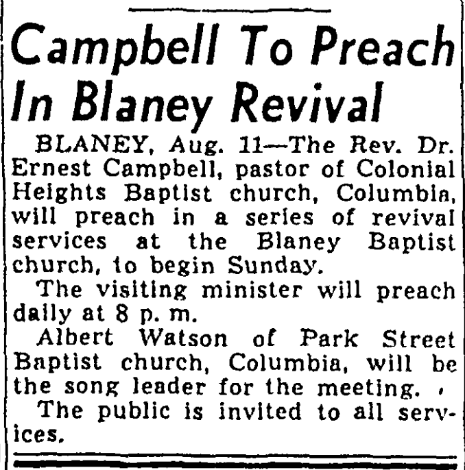 BLANEY, Aug. 11 – The Rev. Dr. Ernest Campbell, pastor of Colonial Heights Baptist church, Columbia, will preach in a series of revival services at the Balney Baptist church, to begin Sunday.